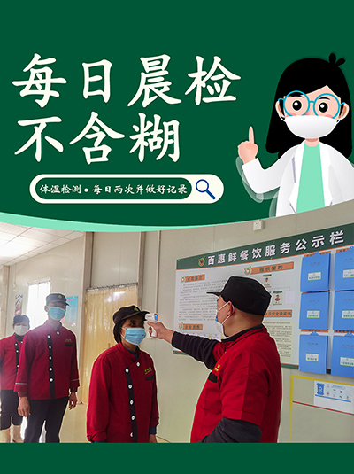 百惠鮮膳食安全部根據(jù)團(tuán)膳行業(yè)特點(diǎn)及疫情變化態(tài)勢(shì),持續(xù)更新《百惠鮮防疫防控手冊(cè)》,從食材來(lái)源到餐廳食安管理制定了科學(xué)全面的防疫防控規(guī)定,并通過(guò)培訓(xùn)指導(dǎo)、海報(bào)宣傳、巡店抽檢、專項(xiàng)考核等方式嚴(yán)格落實(shí)防疫工作,確保各營(yíng)業(yè)點(diǎn)執(zhí)行到位。